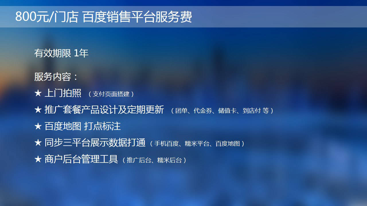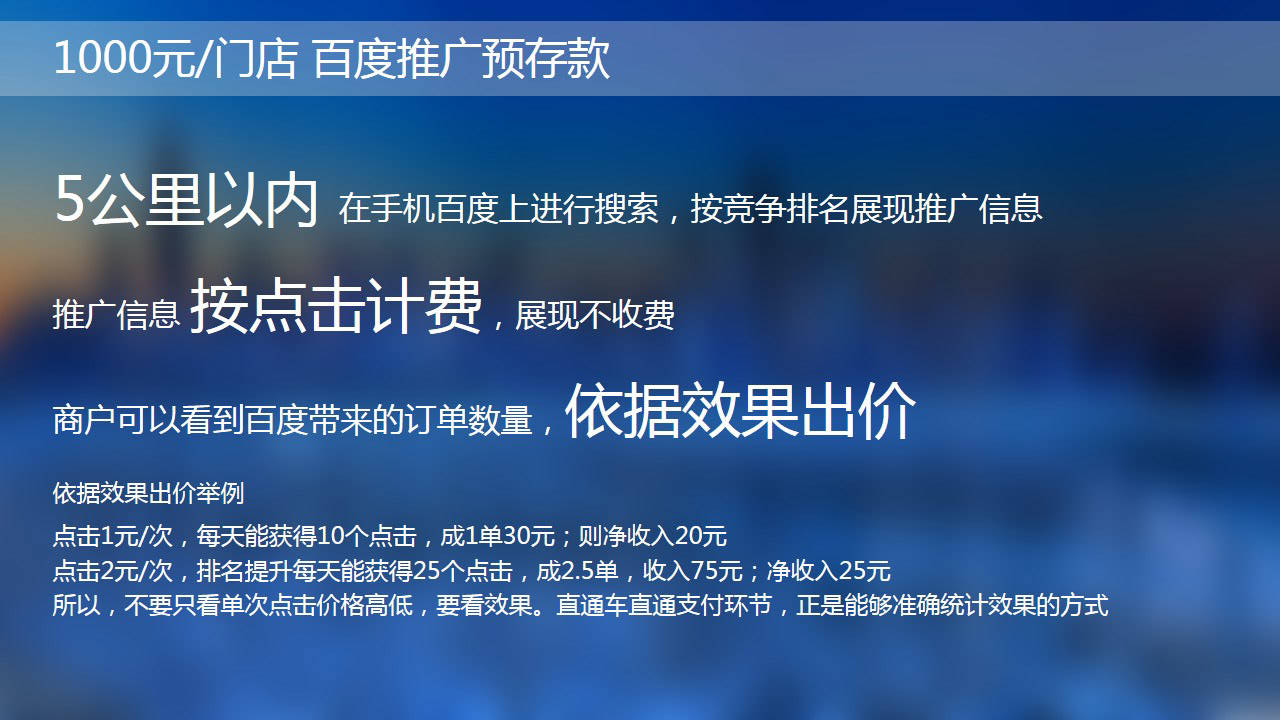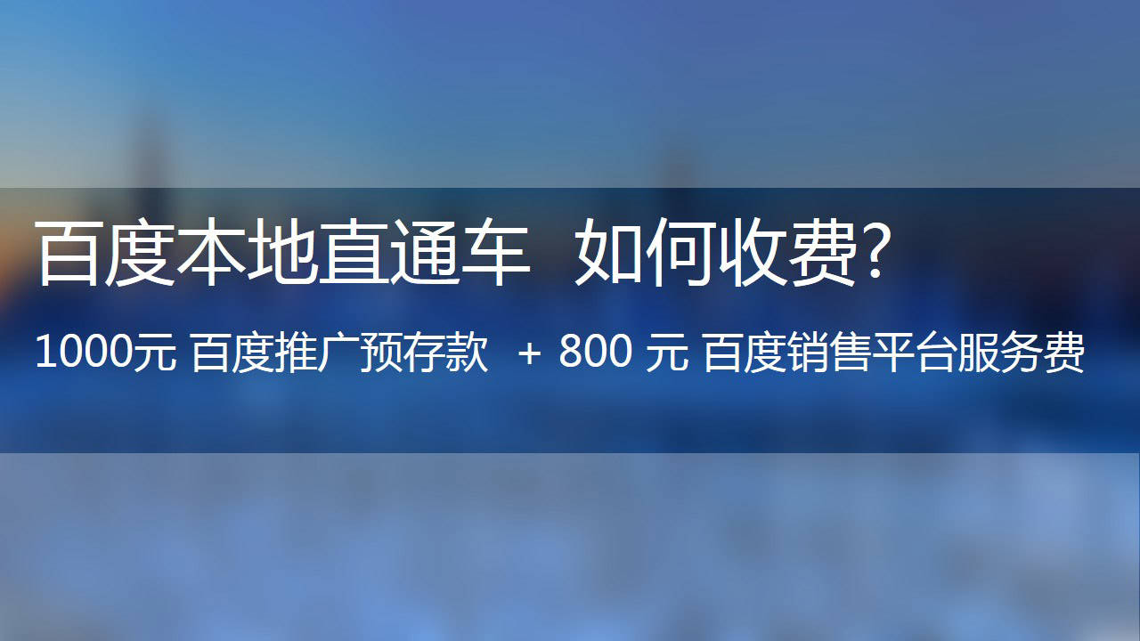 不是8000?不是6000?是的,你没看错!是1800!百度填补搜索与团购之空白的“本地直通车”重磅出击! 方圆5~30公里,百度地图、百度糯米、百度网页搜索都可以精准定位,本地生活服务类的商家店铺不怕你做不起就怕你不敢于尝试,行业的引领者往往就是第一个吃螃蟹的!2015年10月20日针对于生活服务类行业百度推出百度直通车。
