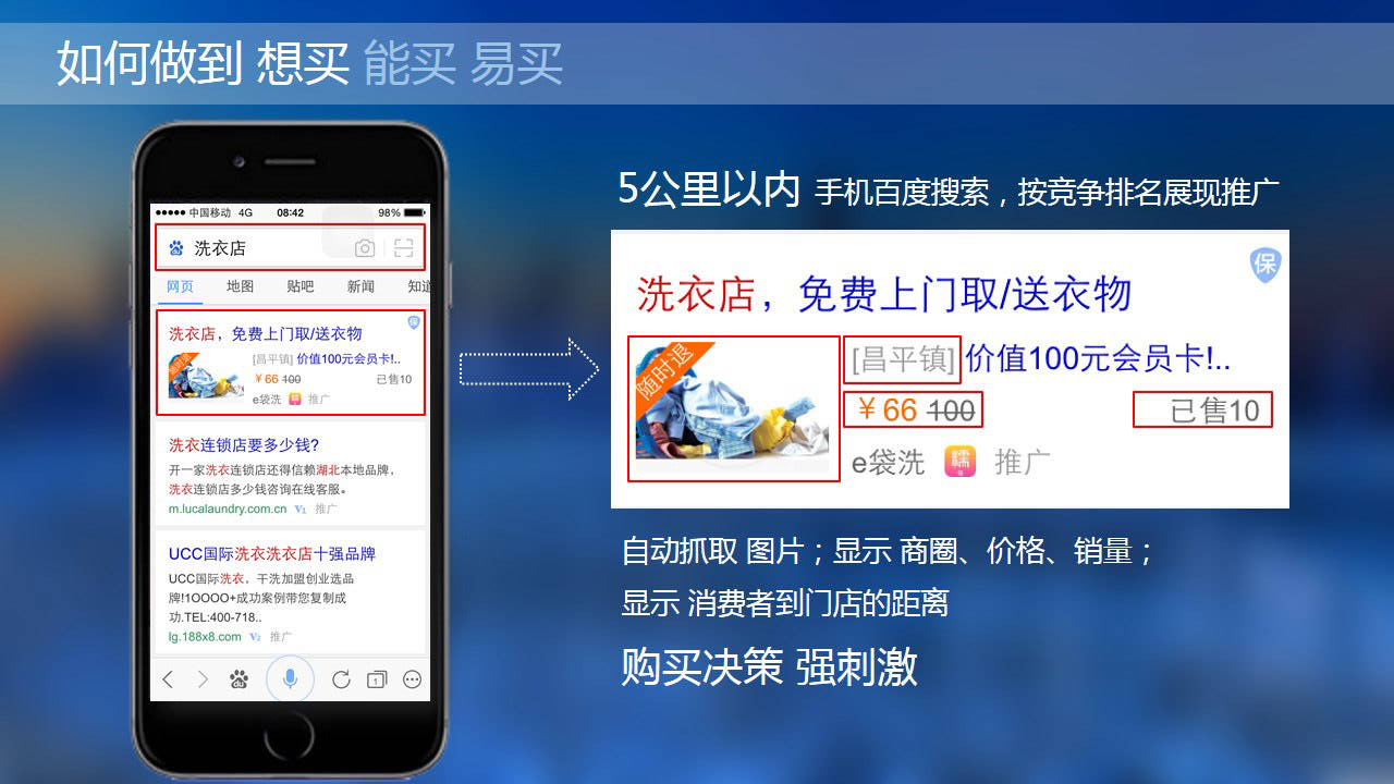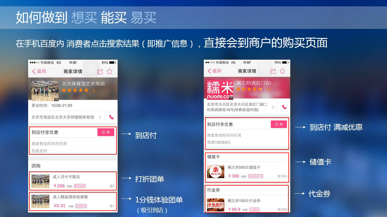 以关键词触发,基于百度大流量手机端搜索。契合百度糯米团购的低价与及时支付功能。加上百度地图精准定位功能。三大平台完美契合,迅速提升企业销售额和品牌知名度。为企业和潜在客户间,架设双效沟通的桥梁。